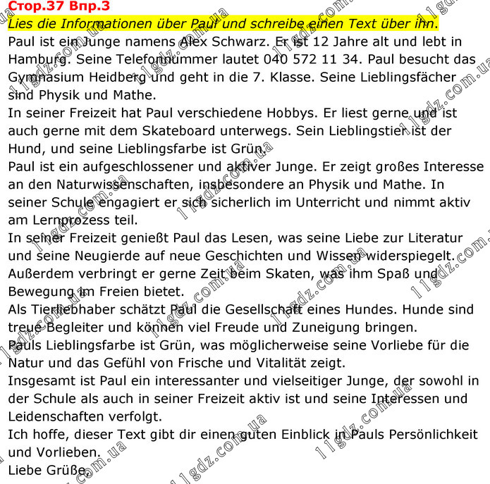 Стор.37 Впр.3 Lies die Informationen über Paul und schreibe einen Text über ihn. Paul ist ein Junge namens Alex Schwarz. Er ist 12 Jahre alt und lebt in Hamburg. Seine Telefonnummer lautet 040 572 11 34. Paul besucht das Gymnasium Heidberg und geht in die 7. Klasse. Seine Lieblingsfächer sind Physik und Mathe. In seiner Freizeit hat Paul verschiedene Hobbys. Er liest gerne und ist auch gerne mit dem Skateboard unterwegs. Sein Lieblingstier ist der Hund, und seine Lieblingsfarbe ist Grün. Paul ist ein aufgeschlossener und aktiver Junge. Er zeigt großes Interesse an den Naturwissenschaften, insbesondere an Physik und Mathe. In seiner Schule engagiert er sich sicherlich im Unterricht und nimmt aktiv am Lernprozess teil. In seiner Freizeit genießt Paul das Lesen, was seine Liebe zur Literatur und seine Neugierde auf neue Geschichten und Wissen widerspiegelt. Außerdem verbringt er gerne Zeit beim Skaten, was ihm Spaß und Bewegung im Freien bietet. Als Tierliebhaber schätzt Paul die Gesellschaft eines Hundes. Hunde sind treue Begleiter und können viel Freude und Zuneigung bringen. Pauls Lieblingsfarbe ist Grün, was möglicherweise seine Vorliebe für die Natur und das Gefühl von Frische und Vitalität zeigt. Insgesamt ist Paul ein interessanter und vielseitiger Junge, der sowohl in der Schule als auch in seiner Freizeit aktiv ist und seine Interessen und Leidenschaften verfolgt. Ich hoffe, dieser Text gibt dir einen guten Einblick in Pauls Persönlichkeit und Vorlieben. Liebe Grüße,