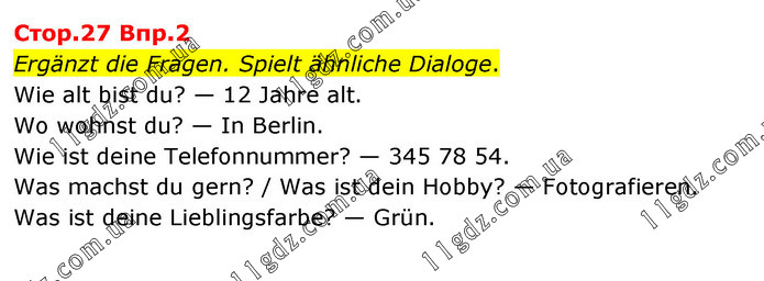 Cтоp.27 Bпp.2 Ergänzt die Fragen. Spielt ähnliche Dialoge. Wie alt bist du? — 12 Jahre alt. Wo wohnst du? — In Berlin. Wie ist deine Telefonnummer? — 345 78 54. Was machst du gern? / Was ist dein Hobby? — Fotografieren. Was ist deine Lieblingsfarbe? — Grün.