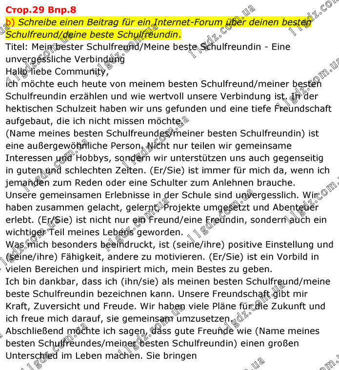 Стор.29 Впр.8 b) Schreibe einen Beitrag für ein Internet-Forum über deinen besten Schulfreund/deine beste Schulfreundin. Titel: Mein bester Schulfreund/Meine beste Schulfreundin - Eine unvergessliche Verbindung Hallo liebe Community, ich möchte euch heute von meinem besten Schulfreund/meiner besten Schulfreundin erzählen und wie wertvoll unsere Verbindung ist. In der hektischen Schulzeit haben wir uns gefunden und eine tiefe Freundschaft aufgebaut, die ich nicht missen möchte. (Name meines besten Schulfreundes/meiner besten Schulfreundin) ist eine außergewöhnliche Person. Nicht nur teilen wir gemeinsame Interessen und Hobbys, sondern wir unterstützen uns auch gegenseitig in guten und schlechten Zeiten. (Er/Sie) ist immer für mich da, wenn ich jemanden zum Reden oder eine Schulter zum Anlehnen brauche. Unsere gemeinsamen Erlebnisse in der Schule sind unvergesslich. Wir haben zusammen gelacht, gelernt, Projekte umgesetzt und Abenteuer erlebt. (Er/Sie) ist nicht nur ein Freund/eine Freundin, sondern auch ein wichtiger Teil meines Lebens geworden. Was mich besonders beeindruckt, ist (seine/ihre) positive Einstellung und (seine/ihre) Fähigkeit, andere zu motivieren. (Er/Sie) ist ein Vorbild in vielen Bereichen und inspiriert mich, mein Bestes zu geben. Ich bin dankbar, dass ich (ihn/sie) als meinen besten Schulfreund/meine beste Schulfreundin bezeichnen kann. Unsere Freundschaft gibt mir Kraft, Zuversicht und Freude. Wir haben viele Pläne für die Zukunft und ich freue mich darauf, sie gemeinsam umzusetzen. Abschließend möchte ich sagen, dass gute Freunde wie (Name meines besten Schulfreundes/meiner besten Schulfreundin) einen großen Unterschied im Leben machen. Sie bringen
