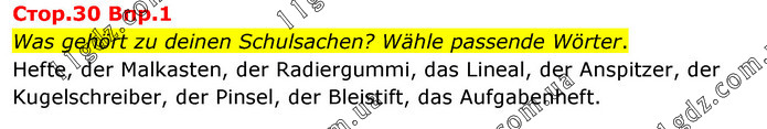 Cтоp.30 Bпp.1 Was gehört zu deinen Schulsachen? Wähle passende Wörter. Hefte, der Malkasten, der Radiergummi, das Lineal, der Anspitzer, der Kugelschreiber, der Pinsel, der Bleistift, das Aufgabenheft.