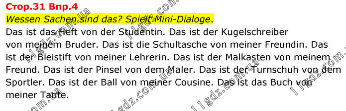 Cтоp.31 Bпp.4 Wessen Sachen sind das? Spielt Mini-Dialoge. Das ist das Heft von der Studentin. Das ist der Kugelschreiber von meinem Bruder. Das ist die Schultasche von meiner Freundin. Das ist der Bleistift von meiner Lehrerin. Das ist der Malkasten von meinem Freund. Das ist der Pinsel von dem Maler. Das ist der Turnschuh von dem Sportler. Das ist der Ball von meiner Cousine. Das ist das Buch von meiner Tante.