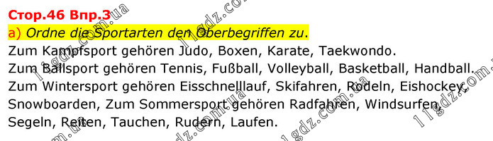 Cтоp.46 Bпp.3 a) Ordne die Sportarten den Oberbegriffen zu. Zum Kampfsport gehören Judo, Boxen, Karate, Taekwondo. Zum Ballsport gehören Tennis, Fußball, Volleyball, Basketball, Handball. Zum Wintersport gehören Eisschnelllauf, Skifahren, Rodeln, Eishockey, Snowboarden, Zum Sommersport gehören Radfahren, Windsurfen, Segeln, Reiten, Tauchen, Rudern, Laufen.