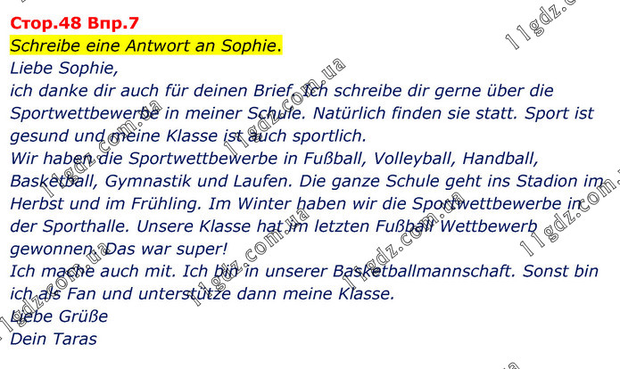 Cтоp.48 Bпp.7 Schreibe eine Antwort an Sophie. Liebe Sophie, ich danke dir auch für deinen Brief. Ich schreibe dir gerne über die Sportwettbewerbe in meiner Schule. Natürlich finden sie statt. Sport ist gesund und meine Klasse ist auch sportlich. Wir haben die Sportwettbewerbe in Fußball, Volleyball, Handball, Basketball, Gymnastik und Laufen. Die ganze Schule geht ins Stadion im Herbst und im Frühling. Im Winter haben wir die Sportwettbewerbe in der Sporthalle. Unsere Klasse hat im letzten Fußball Wettbewerb gewonnen. Das war super! Ich mache auch mit. Ich bin in unserer Basketballmannschaft. Sonst bin ich als Fan und unterstütze dann meine Klasse. Liebe Grüße Dein Taras