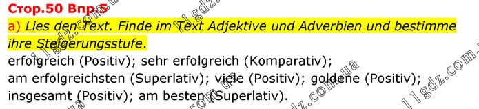 Стор.50 Впр.5 a) Lies den Text. Finde im Text Adjektive und Adverbien und bestimme ihre Steigerungsstufe. erfolgreich (Positiv); sehr erfolgreich (Komparativ); am erfolgreichsten (Superlativ); viele (Positiv); goldene (Positiv); insgesamt (Positiv); am besten (Superlativ).