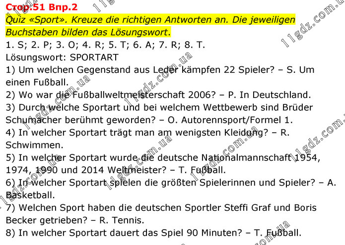 Стоp.51 Bпp.2 Quiz «Sport». Kreuze die richtigen Antworten an. Die jeweiligen Buchstaben bilden das Lösungswort. 1. S; 2. P; 3. O; 4. R; 5. T; 6. A; 7. R; 8. T. Lösungswort: SPORTART 1) Um welchen Gegenstand aus Leder kämpfen 22 Spieler? – S. Um einen Fußball. 2) Wo war die Fußballweltmeisterschaft 2006? – P. In Deutschland. 3) Durch welche Sportart und bei welchem Wettbewerb sind Brüder Schumacher berühmt geworden? – O. Autorennsport/Formel 1. 4) In welcher Sportart trägt man am wenigsten Kleidung? – R. Schwimmen. 5) In welcher Sportart wurde die deutsche Nationalmannschaft 1954, 1974, 1990 und 2014 Weltmeister? – T. Fußball. 6) In welcher Sportart spielen die größten Spielerinnen und Spieler? – A. Basketball. 7) Welchen Sport haben die deutschen Sportler Steffi Graf und Boris Becker getrieben? – R. Tennis. 8) In welcher Sportart dauert das Spiel 90 Minuten? – T. Fußball.