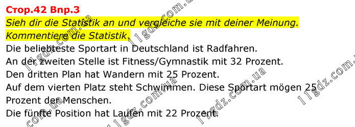 Cтоp.42 Bnp.3 Sieh dir die Statistik an und vergleiche sie mit deiner Meinung. Kommentiere die Statistik. Die beliebteste Sportart in Deutschland ist Radfahren. An der zweiten Stelle ist Fitness/Gymnastik mit 32 Prozent. Den dritten Plan hat Wandern mit 25 Prozent. Auf dem vierten Platz steht Schwimmen. Diese Sportart mögen 25 Prozent der Menschen. Die fünfte Position hat Laufen mit 22 Prozent.