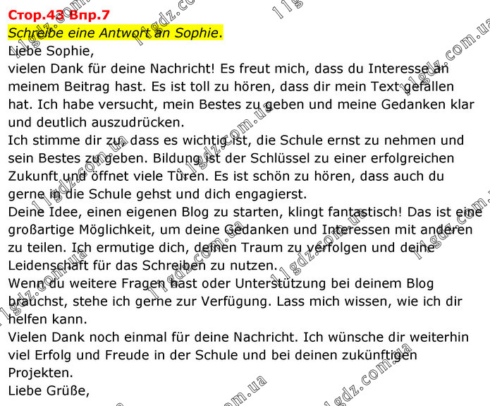 Стор.43 Впр.7 Schreibe eine Antwort an Sophie. Liebe Sophie, vielen Dank für deine Nachricht! Es freut mich, dass du Interesse an meinem Beitrag hast. Es ist toll zu hören, dass dir mein Text gefallen hat. Ich habe versucht, mein Bestes zu geben und meine Gedanken klar und deutlich auszudrücken. Ich stimme dir zu, dass es wichtig ist, die Schule ernst zu nehmen und sein Bestes zu geben. Bildung ist der Schlüssel zu einer erfolgreichen Zukunft und öffnet viele Türen. Es ist schön zu hören, dass auch du gerne in die Schule gehst und dich engagierst. Deine Idee, einen eigenen Blog zu starten, klingt fantastisch! Das ist eine großartige Möglichkeit, um deine Gedanken und Interessen mit anderen zu teilen. Ich ermutige dich, deinen Traum zu verfolgen und deine Leidenschaft für das Schreiben zu nutzen. Wenn du weitere Fragen hast oder Unterstützung bei deinem Blog brauchst, stehe ich gerne zur Verfügung. Lass mich wissen, wie ich dir helfen kann. Vielen Dank noch einmal für deine Nachricht. Ich wünsche dir weiterhin viel Erfolg und Freude in der Schule und bei deinen zukünftigen Projekten. Liebe Grüße,