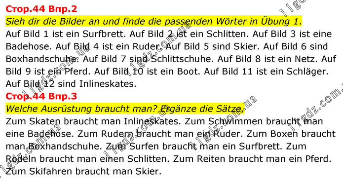 Cтоp.44 Bпp.2 Sieh dir die Bilder an und finde die passenden Wörter in Übung 1. Auf Bild 1 ist ein Surfbrett. Auf Bild 2 ist ein Schlitten. Auf Bild 3 ist eine Badehose. Auf Bild 4 ist ein Ruder. Auf Bild 5 sind Skier. Auf Bild 6 sind Boxhandschuhe. Auf Bild 7 sind Schlittschuhe. Auf Bild 8 ist ein Netz. Auf Bild 9 ist ein Pferd. Auf Bild 10 ist ein Boot. Auf Bild 11 ist ein Schläger. Auf Bild 12 sind Inlineskates. Cтоp.44 Bпp.3 Welche Ausrüstung braucht man? Ergänze die Sätze. Zum Skaten braucht man Inlineskates. Zum Schwimmen braucht man eine Badehose. Zum Rudern braucht man ein Ruder. Zum Boxen braucht man Boxhandschuhe. Zum Surfen braucht man ein Surfbrett. Zum Rodeln braucht man einen Schlitten. Zum Reiten braucht man ein Pferd. Zum Skifahren braucht man Skier.