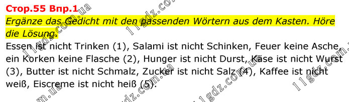 Cтоp.55 Bпp.1 Ergänze das Gedicht mit den passenden Wörtern aus dem Kasten. Höre die Lösung. Essen ist nicht Trinken (1), Salami ist nicht Schinken, Feuer keine Asche, ein Korken keine Flasche (2), Hunger ist nicht Durst, Käse ist nicht Wurst (3), Butter ist nicht Schmalz, Zucker ist nicht Salz (4), Kaffee ist nicht weiß, Eiscreme ist nicht heiß (5).