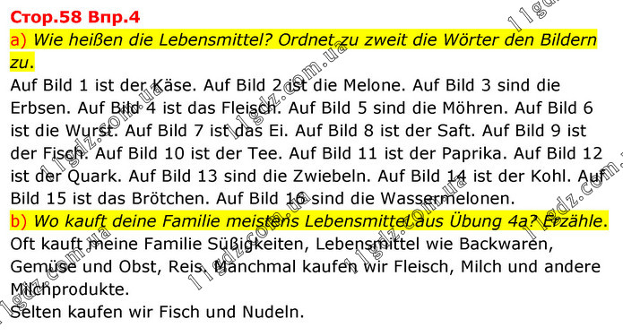 Cтоp.58 Bпp.4 a) Wie heißen die Lebensmittel? Ordnet zu zweit die Wörter den Bildern zu. Auf Bild 1 ist der Käse. Auf Bild 2 ist die Melone. Auf Bild 3 sind die Erbsen. Auf Bild 4 ist das Fleisch. Auf Bild 5 sind die Möhren. Auf Bild 6 ist die Wurst. Auf Bild 7 ist das Ei. Auf Bild 8 ist der Saft. Auf Bild 9 ist der Fisch. Auf Bild 10 ist der Tee. Auf Bild 11 ist der Paprika. Auf Bild 12 ist der Quark. Auf Bild 13 sind die Zwiebeln. Auf Bild 14 ist der Kohl. Auf Bild 15 ist das Brötchen. Auf Bild 16 sind die Wassermelonen. b) Wo kauft deine Familie meistens Lebensmittel aus Übung 4a? Erzähle. Oft kauft meine Familie Süßigkeiten, Lebensmittel wie Backwaren, Gemüse und Obst, Reis. Manchmal kaufen wir Fleisch, Milch und andere Milchprodukte. Selten kaufen wir Fisch und Nudeln.