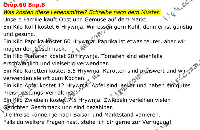 Стор.60 Впр.6 Was kosten diese Lebensmittel? Schreibe nach dem Muster. Unsere Familie kauft Obst und Gemüse auf dem Markt. Ein Kilo Kohl kostet 6 Hrywnja. Wir essen gern Kohl, denn er ist günstig und gesund. Ein Kilo Paprika kostet 60 Hrywnja. Paprika ist etwas teurer, aber wir mögen den Geschmack. Ein Kilo Tomaten kostet 20 Hrywnja. Tomaten sind ebenfalls erschwinglich und vielseitig verwendbar. Ein Kilo Karotten kostet 5,5 Hrywnja. Karotten sind preiswert und wir verwenden sie oft zum Kochen. Ein Kilo Äpfel kostet 12 Hrywnja. Äpfel sind lecker und haben ein gutes Preis-Leistungs-Verhältnis. Ein Kilo Zwiebeln kostet 7,5 Hrywnja. Zwiebeln verleihen vielen Gerichten Geschmack und sind bezahlbar. Die Preise können je nach Saison und Marktstand variieren. Falls du weitere Fragen hast, stehe ich dir gerne zur Verfügung!