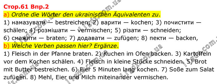Cтоp.61 Bпp.2 a) Ordne die Wörter den ukrainischen Äquivalenten zu. 1) намазувати — bestreichen; 2) варити — kochen; 3) почистити — schälen; 4) poзмішати — vermischen; 5) piзати — schneiden; 6) cмажити — braten; 7) додавати — zufügen; 8) пекти — backen, b) Welche Verben passen hier? Ergänze. 1) Fleisch in der Pfanne braten. 2) Kuchen im Ofen backen. 3) Kartoffeln vor dem Kochen schälen. 4) Fleisch in kleine Stücke schneiden. 5) Brot mit Butter bestreichen. 6) Eier 5 Minuten lang kochen. 7) Soße zum Salat zufügen. 8) Mehl, Eier und Milch miteinander vermischen.