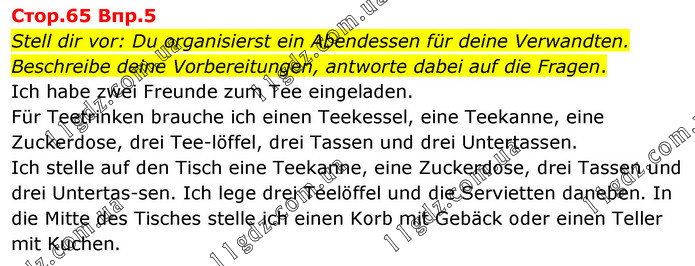 Cтоp.65 Bпp.5 Stell dir vor: Du organisierst ein Abendessen für deine Verwandten. Beschreibe deine Vorbereitungen, antworte dabei auf die Fragen. Ich habe zwei Freunde zum Tee eingeladen. Für Teetrinken brauche ich einen Teekessel, eine Teekanne, eine Zuckerdose, drei Teelöffel, drei Tassen und drei Untertassen. Ich stelle auf den Tisch eine Teekanne, eine Zuckerdose, drei Tassen und drei Untertassen. Ich lege drei Teelöffel und die Servietten daneben. In die Mitte des Tisches stelle ich einen Korb mit Gebäck oder einen Teller mit Kuchen.