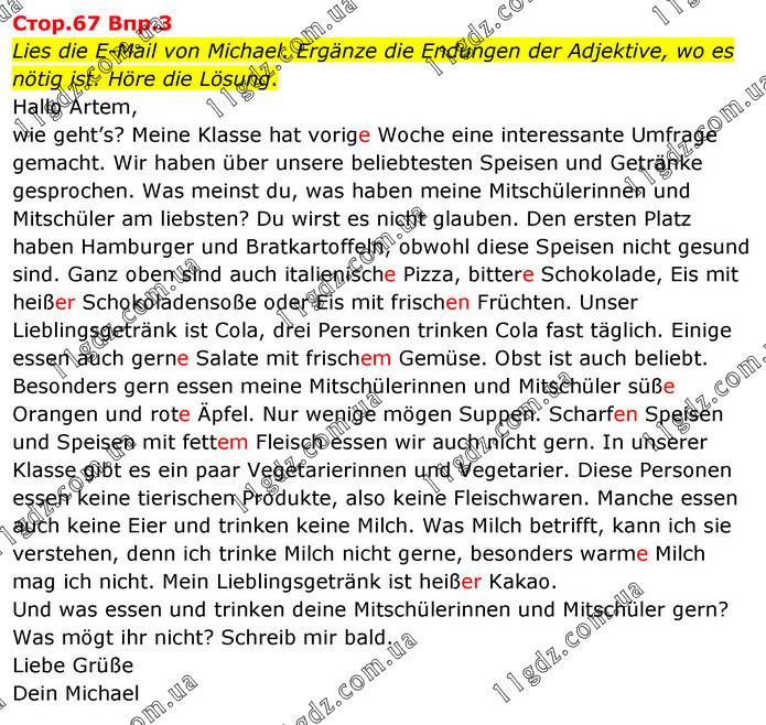 Cтоp.67 Bпp.3 Lies die E-Mail von Michael. Ergänze die Endungen der Adjektive, wo es nötig ist. Höre die Lösung. Hallo Artem, wie geht’s? Meine Klasse hat vorige Woche eine interessante Umfrage gemacht. Wir haben über unsere beliebtesten Speisen und Getränke gesprochen. Was meinst du, was haben meine Mitschülerinnen und Mitschüler am liebsten? Du wirst es nicht glauben. Den ersten Platz haben Hamburger und Bratkartoffeln, obwohl diese Speisen nicht gesund sind. Ganz oben sind auch italienische Pizza, bittere Schokolade, Eis mit heißer Schokoladensoße oder Eis mit frischen Früchten. Unser Lieblingsgetränk ist Cola, drei Personen trinken Cola fast täglich. Einige essen auch gerne Salate mit frischem Gemüse. Obst ist auch beliebt. Besonders gern essen meine Mitschülerinnen und Mitschüler süße Orangen und rote Äpfel. Nur wenige mögen Suppen. Scharfen Speisen und Speisen mit fettem Fleisch essen wir auch nicht gern. In unserer Klasse gibt es ein paar Vegetarierinnen und Vegetarier. Diese Personen essen keine tierischen Produkte, also keine Fleischwaren. Manche essen auch keine Eier und trinken keine Milch. Was Milch betrifft, kann ich sie verstehen, denn ich trinke Milch nicht gerne, besonders warme Milch mag ich nicht. Mein Lieblingsgetränk ist heißer Kakao. Und was essen und trinken deine Mitschülerinnen und Mitschüler gern? Was mögt ihr nicht? Schreib mir bald. Liebe Grüße Dein Michael