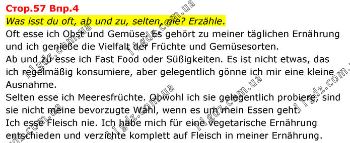 Стор.57 Впр.4 Was isst du oft, ab und zu, selten, nie? Erzähle. Oft esse ich Obst und Gemüse. Es gehört zu meiner täglichen Ernährung und ich genieße die Vielfalt der Früchte und Gemüsesorten. Ab und zu esse ich Fast Food oder Süßigkeiten. Es ist nicht etwas, das ich regelmäßig konsumiere, aber gelegentlich gönne ich mir eine kleine Ausnahme. Selten esse ich Meeresfrüchte. Obwohl ich sie gelegentlich probiere, sind sie nicht meine bevorzugte Wahl, wenn es um mein Essen geht. Ich esse Fleisch nie. Ich habe mich für eine vegetarische Ernährung entschieden und verzichte komplett auf Fleisch in meiner Ernährung.