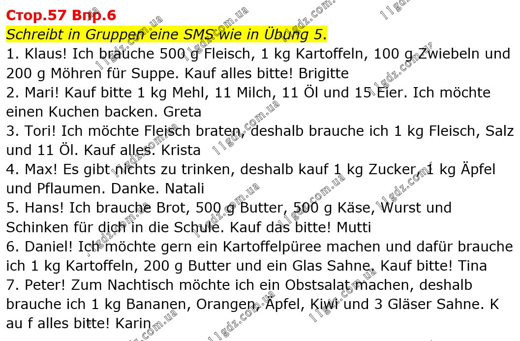 Стор.57 Впр.6 Schreibt in Gruppen eine SMS wie in Übung 5. 1. Klaus! Ich brauche 500 g Fleisch, 1 kg Kartoffeln, 100 g Zwiebeln und 200 g Möhren für Suppe. Kauf alles bitte! Brigitte 2. Mari! Kauf bitte 1 kg Mehl, 11 Milch, 11 Öl und 15 Eier. Ich möchte einen Kuchen backen. Greta 3. Tori! Ich möchte Fleisch braten, deshalb brauche ich 1 kg Fleisch, Salz und 11 Öl. Kauf alles. Krista 4. Max! Es gibt nichts zu trinken, deshalb kauf 1 kg Zucker, 1 kg Äpfel und Pflaumen. Danke. Natali 5. Hans! Ich brauche Brot, 500 g Butter, 500 g Käse, Wurst und Schinken für dich in die Schule. Kauf das bitte! Mutti 6. Daniel! Ich möchte gern ein Kartoffelpüree machen und dafür brauche ich 1 kg Kartoffeln, 200 g Butter und ein Glas Sahne. Kauf bitte! Tina 7. Peter! Zum Nachtisch möchte ich ein Obstsalat machen, deshalb brauche ich 1 kg Bananen, Orangen, Äpfel, Kiwi und 3 Gläser Sahne. K au f alles bitte! Karin