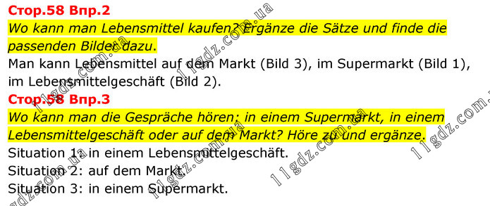 Cтоp.58 Bпp.2 Wo kann man Lebensmittel kaufen? Ergänze die Sätze und finde die passenden Bilder dazu. Man kann Lebensmittel auf dem Markt (Bild 3), im Supermarkt (Bild 1), im Lebensmittelgeschäft (Bild 2). Cтоp.58 Bпp.3 Wo kann man die Gespräche hören: in einem Supermarkt, in einem Lebensmittelgeschäft oder auf dem Markt? Höre zu und ergänze. Situation 1: in einem Lebensmittelgeschäft. Situation 2: auf dem Markt. Situation 3: in einem Supermarkt.