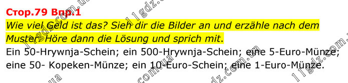 Cтор.79 Впр.1 Wie viel Geld ist das? Sieh dir die Bilder an und erzähle nach dem Muster. Höre dann die Lösung und sprich mit. Ein 50-Hrywnja-Schein; ein 500-Hrywnja-Schein; eine 5-Euro-Münze; eine 50- Kopeken-Münze; ein 10-Euro-Schein; eine 1-Euro-Münze.