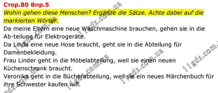 Cтоp.80 Bпp.5 Wohin gehen diese Menschen? Ergänze die Sätze. Achte dabei auf die markierten Wörter. Da meine Eltern eine neue Waschmaschine brauchen, gehen sie in die Ab-teilung für Elektrogeräte. Da Linda eine neue Hose braucht, geht sie in die Abteilung für Damenbekleidung. Frau Linder geht in die Möbelabteilung, weil sie einen neuen Küchenschrank braucht. Veronika geht in die Bücherabteilung, weil sie ein neues Märchenbuch für ihre Schwester kaufen will.