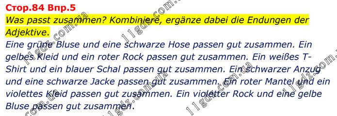 Стор.84 Впр.5 Was passt zusammen? Kombiniere, ergänze dabei die Endungen der Adjektive. Eine grüne Bluse und eine schwarze Hose passen gut zusammen. Ein gelbes Kleid und ein roter Rock passen gut zusammen. Ein weißes T-Shirt und ein blauer Schal passen gut zusammen. Ein schwarzer Anzug und eine schwarze Jacke passen gut zusammen. Ein roter Mantel und ein violettes Kleid passen gut zusammen. Ein violetter Rock und eine gelbe Bluse passen gut zusammen.
