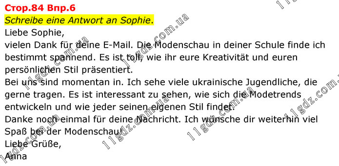 Стор.84 Впр.6 Schreibe eine Antwort an Sophie. Liebe Sophie, vielen Dank für deine E-Mail. Die Modenschau in deiner Schule finde ich bestimmt spannend. Es ist toll, wie ihr eure Kreativität und euren persönlichen Stil präsentiert. Bei uns sind momentan in. Ich sehe viele ukrainische Jugendliche, die gerne tragen. Es ist interessant zu sehen, wie sich die Modetrends entwickeln und wie jeder seinen eigenen Stil findet. Danke noch einmal für deine Nachricht. Ich wünsche dir weiterhin viel Spaß bei der Modenschau! Liebe Grüße, Anna
