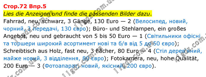 Стор.72 Впр.5 Lies die Anzeigen und finde die passenden Bilder dazu. Fahrrad, neu, schwarz, 3 Gänge, 130 Euro — 2 (Велосипед, новий, чорний, 3 передачі, 130 євро); Büro- und Stehlampen, ein großes Angebot, neu und gebraucht von 5 bis 50 Euro — 1 (Світильники офісні та торшери широкий асортимент нові та б/в від 5 до 50 євро); Schreibtisch aus Holz, fast neu, 3 Fächer, 80 Euro — 4 (Стіл дерев'яний, майже новий, 3 відділення, 80 євро); Fotokamera, neu, hohe Qualität, 200 Euro — 3 (Фотоапарат, новий, якісний, 200 євро).