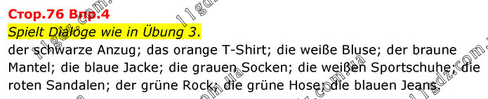 Стор.76 Впр.4 Spielt Dialoge wie in Übung 3. der schwarze Anzug; das orange T-Shirt; die weiße Bluse; der braune Mantel; die blaue Jacke; die grauen Socken; die weißen Sportschuhe; die roten Sandalen; der grüne Rock; die grüne Hose; die blauen Jeans.