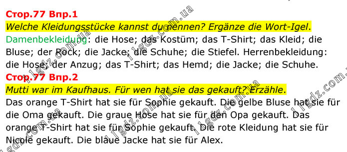 Стор.77 Впр.1 Welche Kleidungsstücke kannst du nennen? Ergänze die Wort-Igel. Damenbekleidung: die Hose; das Kostüm; das T-Shirt; das Kleid; die Bluse; der Rock; die Jacke; die Schuhe; die Stiefel. Herrenbekleidung: die Hose; der Anzug; das T-Shirt; das Hemd; die Jacke; die Schuhe. Cтоp.77 Bпp.2 Mutti war im Kaufhaus. Für wen hat sie das gekauft? Erzähle. Das orange T-Shirt hat sie für Sophie gekauft. Die gelbe Bluse hat sie für die Oma gekauft. Die graue Hose hat sie für den Opa gekauft. Das orange T-Shirt hat sie für Sophie gekauft. Die rote Kleidung hat sie für Nicole gekauft. Die blaue Jacke hat sie für Alex.