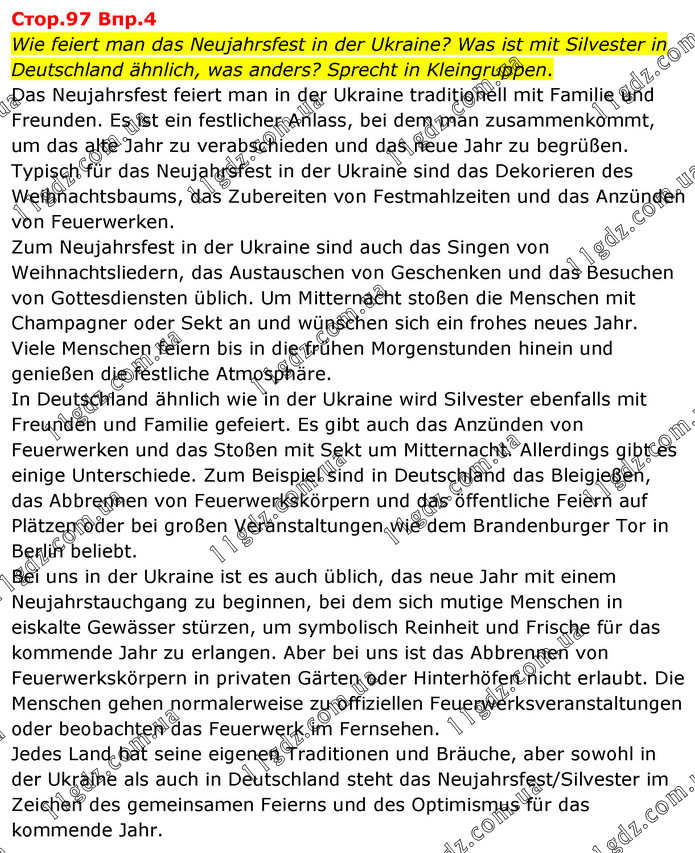 Стор.97 Впр.4 Wie feiert man das Neujahrsfest in der Ukraine? Was ist mit Silvester in Deutschland ähnlich, was anders? Sprecht in Kleingruppen. Das Neujahrsfest feiert man in der Ukraine traditionell mit Familie und Freunden. Es ist ein festlicher Anlass, bei dem man zusammenkommt, um das alte Jahr zu verabschieden und das neue Jahr zu begrüßen. Typisch für das Neujahrsfest in der Ukraine sind das Dekorieren des Weihnachtsbaums, das Zubereiten von Festmahlzeiten und das Anzünden von Feuerwerken. Zum Neujahrsfest in der Ukraine sind auch das Singen von Weihnachtsliedern, das Austauschen von Geschenken und das Besuchen von Gottesdiensten üblich. Um Mitternacht stoßen die Menschen mit Champagner oder Sekt an und wünschen sich ein frohes neues Jahr. Viele Menschen feiern bis in die frühen Morgenstunden hinein und genießen die festliche Atmosphäre. In Deutschland ähnlich wie in der Ukraine wird Silvester ebenfalls mit Freunden und Familie gefeiert. Es gibt auch das Anzünden von Feuerwerken und das Stoßen mit Sekt um Mitternacht. Allerdings gibt es einige Unterschiede. Zum Beispiel sind in Deutschland das Bleigießen, das Abbrennen von Feuerwerkskörpern und das öffentliche Feiern auf Plätzen oder bei großen Veranstaltungen wie dem Brandenburger Tor in Berlin beliebt. Bei uns in der Ukraine ist es auch üblich, das neue Jahr mit einem Neujahrstauchgang zu beginnen, bei dem sich mutige Menschen in eiskalte Gewässer stürzen, um symbolisch Reinheit und Frische für das kommende Jahr zu erlangen. Aber bei uns ist das Abbrennen von Feuerwerkskörpern in privaten Gärten oder Hinterhöfen nicht erlaubt. Die Menschen gehen normalerweise zu offiziellen Feuerwerksveranstaltungen oder beobachten das Feuerwerk im Fernsehen. Jedes Land hat seine eigenen Traditionen und Bräuche, aber sowohl in der Ukraine als auch in Deutschland steht das Neujahrsfest/Silvester im Zeichen des gemeinsamen Feierns und des Optimismus für das kommende Jahr.