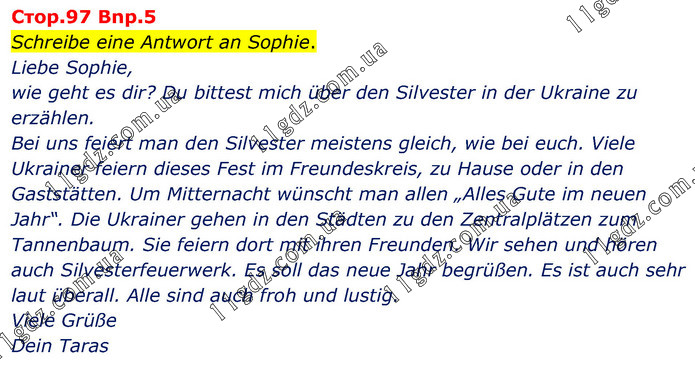 Стор.97 Bnp.5 Schreibe eine Antwort an Sophie. Liebe Sophie, wie geht es dir? Du bittest mich über den Silvester in der Ukraine zu erzählen. Bei uns feiert man den Silvester meistens gleich, wie bei euch. Viele Ukrainer feiern dieses Fest im Freundeskreis, zu Hause oder in den Gaststätten. Um Mitternacht wünscht man allen „Alles Gute im neuen Jahr“. Die Ukrainer gehen in den Städten zu den Zentralplätzen zum Tannenbaum. Sie feiern dort mit ihren Freunden. Wir sehen und hören auch Silvesterfeuerwerk. Es soll das neue Jahr begrüßen. Es ist auch sehr laut überall. Alle sind auch froh und lustig. Viele Grüße Dein Taras