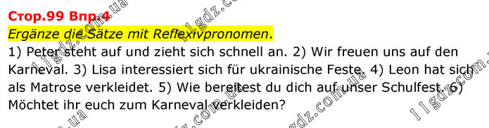 Cтоp.99 Bпp.4 Ergänze die Sätze mit Reflexivpronomen. 1) Peter steht auf und zieht sich schnell an. 2) Wir freuen uns auf den Karneval. 3) Lisa interessiert sich für ukrainische Feste. 4) Leon hat sich als Matrose verkleidet. 5) Wie bereitest du dich auf unser Schulfest. 6) Möchtet ihr euch zum Karneval verkleiden?