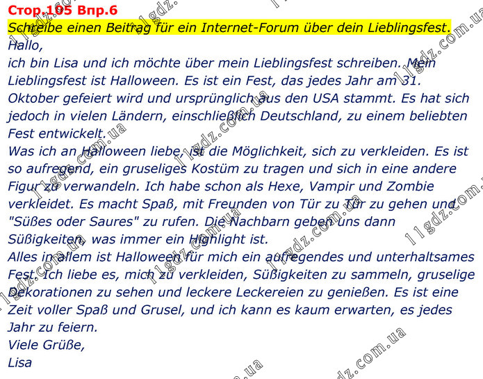 Стор.105 Впр.6 Schreibe einen Beitrag für ein Internet-Forum über dein Lieblingsfest. Hallo, ich bin Lisa und ich möchte über mein Lieblingsfest schreiben. Mein Lieblingsfest ist Halloween. Es ist ein Fest, das jedes Jahr am 31. Oktober gefeiert wird und ursprünglich aus den USA stammt. Es hat sich jedoch in vielen Ländern, einschließlich Deutschland, zu einem beliebten Fest entwickelt. Was ich an Halloween liebe, ist die Möglichkeit, sich zu verkleiden. Es ist so aufregend, ein gruseliges Kostüm zu tragen und sich in eine andere Figur zu verwandeln. Ich habe schon als Hexe, Vampir und Zombie verkleidet. Es macht Spaß, mit Freunden von Tür zu Tür zu gehen und "Süßes oder Saures" zu rufen. Die Nachbarn geben uns dann Süßigkeiten, was immer ein Highlight ist. Alles in allem ist Halloween für mich ein aufregendes und unterhaltsames Fest. Ich liebe es, mich zu verkleiden, Süßigkeiten zu sammeln, gruselige Dekorationen zu sehen und leckere Leckereien zu genießen. Es ist eine Zeit voller Spaß und Grusel, und ich kann es kaum erwarten, es jedes Jahr zu feiern. Viele Grüße, Lisa