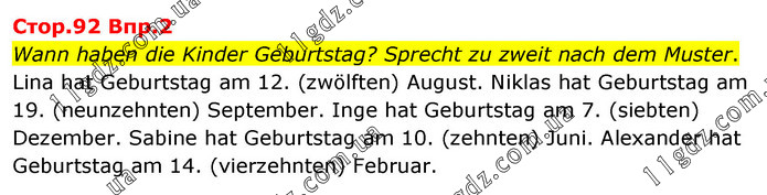 Стор.92 Впр.2 Wann haben die Kinder Geburtstag? Sprecht zu zweit nach dem Muster. Lina hat Geburtstag am 12. (zwölften) August. Niklas hat Geburtstag am 19. (neunzehnten) September. Inge hat Geburtstag am 7. (siebten) Dezember. Sabine hat Geburtstag am 10. (zehnten) Juni. Alexander hat Geburtstag am 14. (vierzehnten) Februar.