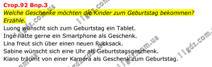 Стор.92 Впр.3 Welche Geschenke möchten die Kinder zum Geburtstag bekommen? Erzähle. Luong wünscht sich zum Geburtstag ein Tablet. Inge hätte gerne ein Smartphone als Geschenk. Lina freut sich über einen neuen Rucksack. Sabine wünscht sich eine Uhr als Geburtstagsgeschenk. Kiano träumt von einer Kamera als Geschenk zum Geburtstag.