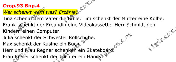 Cтоp.93 Bпp.4 Wer schenkt wem was? Erzähle. Tina schenkt dem Vater die Brille. Tim schenkt der Mutter eine Kolbe. Frank schenkt der Freundin eine Videokassette. Herr Schmidt den Kindern einen Computer. Julia schenkt der Schwester Rollschuhe. Max schenkt der Kusine ein Buch. Herr und Frau Regner schenken ein Skateboard. Frau Rösler schenkt der Tochter ein Handy.
