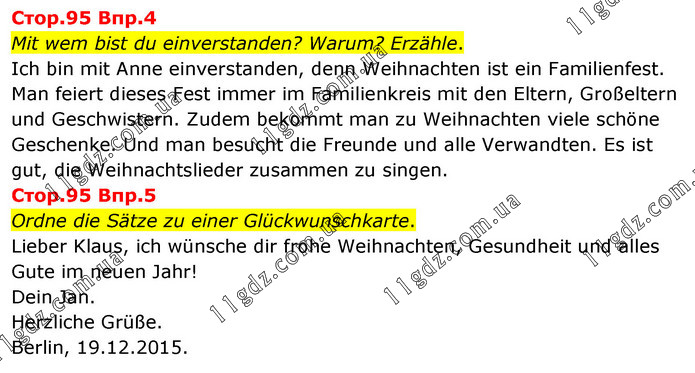 Стор.95 Впр.4 Mit wem bist du einverstanden? Warum? Erzähle. Ich bin mit Anne einverstanden, denn Weihnachten ist ein Familienfest. Man feiert dieses Fest immer im Familienkreis mit den Eltern, Großeltern und Geschwistern. Zudem bekommt man zu Weihnachten viele schöne Geschenke. Und man besucht die Freunde und alle Verwandten. Es ist gut, die Weihnachtslieder zusammen zu singen. Cтоp.95 Bпp.5 Ordne die Sätze zu einer Glückwunschkarte. Lieber Klaus, ich wünsche dir frohe Weihnachten, Gesundheit und alles Gute im neuen Jahr! Dein Jan. Herzliche Grüße. Berlin, 19.12.2015.