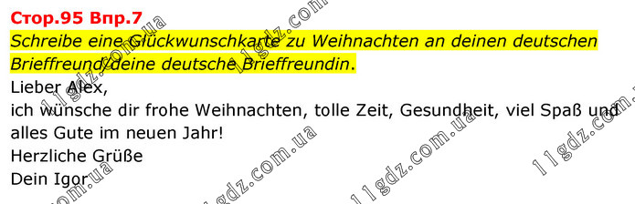 Cтоp.95 Bпp.7 Schreibe eine Glückwunschkarte zu Weihnachten an deinen deutschen Brieffreund/deine deutsche Brieffreundin. Lieber Alex, ich wünsche dir frohe Weihnachten, tolle Zeit, Gesundheit, viel Spaß und alles Gute im neuen Jahr! Herzliche Grüße Dein Igor