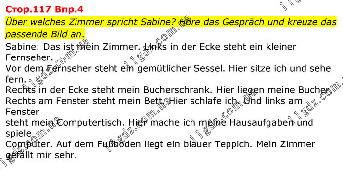 Стор.117 Впр.4 Über welches Zimmer spricht Sabine? Höre das Gespräch und kreuze das passende Bild an. Sabine: Das ist mein Zimmer. Links in der Ecke steht ein kleiner Fernseher. Vor dem Fernseher steht ein gemütlicher Sessel. Hier sitze ich und sehe fern. Rechts in der Ecke steht mein Bucherschrank. Hier liegen meine Bucher. Rechts am Fenster steht mein Bett. Hier schlafe ich. Und links am Fenster steht mein Computertisch. Hier mache ich meine Hausaufgaben und spiele Computer. Auf dem Fußboden liegt ein blauer Teppich. Mein Zimmer gefällt mir sehr.