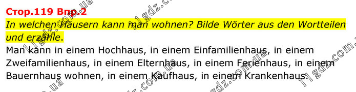 Стор.119 Впр.2 In welchen Häusern kann man wohnen? Bilde Wörter aus den Wortteilen und erzähle. Man kann in einem Hochhaus, in einem Einfamilienhaus, in einem Zweifamilienhaus, in einem Elternhaus, in einem Ferienhaus, in einem Bauernhaus wohnen, in einem Kaufhaus, in einem Krankenhaus.