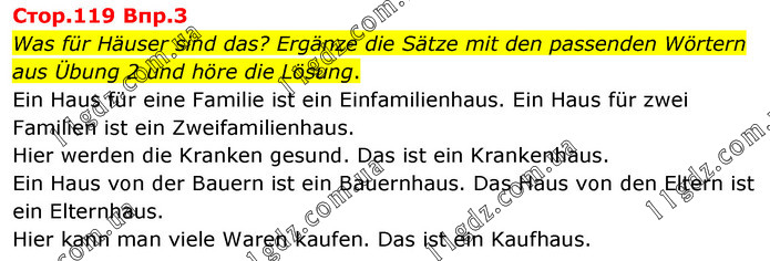 Cтоp.119 Bпp.3 Was für Häuser sind das? Ergänze die Sätze mit den passenden Wörtern aus Übung 2 und höre die Lösung. Ein Haus für eine Familie ist ein Einfamilienhaus. Ein Haus für zwei Familien ist ein Zweifamilienhaus. Hier werden die Kranken gesund. Das ist ein Krankenhaus. Ein Haus von der Bauern ist ein Bauernhaus. Das Haus von den Eltern ist ein Elternhaus. Hier kann man viele Waren kaufen. Das ist ein Kaufhaus.