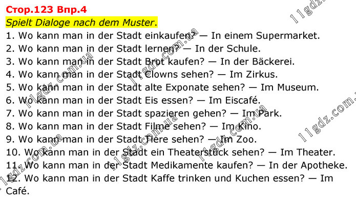 Cтоp.123 Bпp.4 Spielt Dialoge nach dem Muster. 1. Wo kann man in der Stadt einkaufen? — In einem Supermarket. 2. Wo kann man in der Stadt lernen? — In der Schule. 3. Wo kann man in der Stadt Brot kaufen? — In der Bäckerei. 4. Wo kann man in der Stadt Clowns sehen? — Im Zirkus. 5. Wo kann man in der Stadt alte Exponate sehen? — Im Museum. 6. Wo kann man in der Stadt Eis essen? — Im Eiscafé. 7. Wo kann man in der Stadt spazieren gehen? — Im Park. 8. Wo kann man in der Stadt Filme sehen? — Im Kino. 9. Wo kann man in der Stadt Tiere sehen? — Im Zoo. 10. Wo kann man in der Stadt ein Theaterstück sehen? — Im Theater. 11. Wo kann man in der Stadt Medikamente kaufen? — In der Apotheke. 12. Wo kann man in der Stadt Kaffe trinken und Kuchen essen? — Im Café.