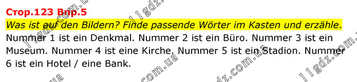 Стор.123 Впр.5 Was ist auf den Bildern? Finde passende Wörter im Kasten und erzähle. Nummer 1 ist ein Denkmal. Nummer 2 ist ein Büro. Nummer 3 ist ein Museum. Nummer 4 ist eine Kirche. Nummer 5 ist ein Stadion. Nummer 6 ist ein Hotel / eine Bank.