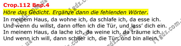 Стор.112 Впр.4 Höre das Gedicht. Ergänze dann die fehlenden Wörter. In meinem Haus, da wohne ich, da schlafe ich, da esse ich. Und wenn du willst, dann offen ich die Tür, und lass’ dich ein. In meinem Haus, da lache ich, da weine ich, da träume ich. Und wenn ich will, dann schlier ich, die Tür, und bin allein.