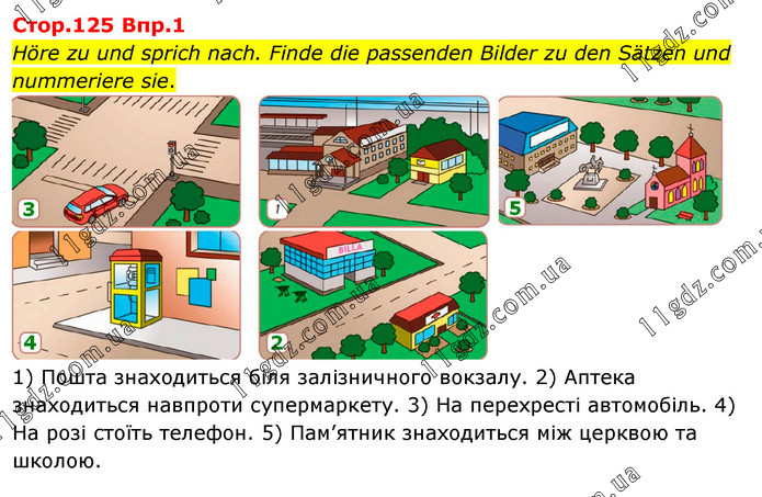 Cтop.125 Bпp.1 Höre zu und sprich nach. Finde die passenden Bilder zu den Sätzen und nummeriere sie. 1) Пошта знаходиться біля залізничного вокзалу. 2) Аптека знаходиться навпроти супермаркету. 3) На перехресті автомобіль. 4) На розі стоїть телефон. 5) Пам’ятник знаходиться між церквою та школою.