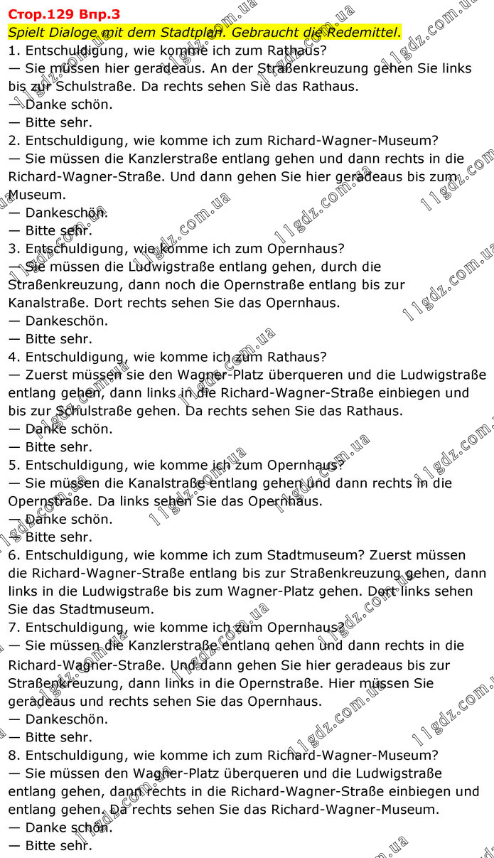 Стор.129 Впр.3 Spielt Dialoge mit dem Stadtplan. Gebraucht die Redemittel. 1. Entschuldigung, wie komme ich zum Rathaus? — Sie müssen hier geradeaus. An der Straßenkreuzung gehen Sie links bis zur Schulstraße. Da rechts sehen Sie das Rathaus. — Danke schön. — Bitte sehr. 2. Entschuldigung, wie komme ich zum Richard-Wagner-Museum? — Sie müssen die Kanzlerstraße entlang gehen und dann rechts in die Richard-Wagner-Straße. Und dann gehen Sie hier geradeaus bis zum Museum. — Dankeschön. — Bitte sehr. 3. Entschuldigung, wie komme ich zum Opernhaus? — Sie müssen die Ludwigstraße entlang gehen, durch die Straßenkreuzung, dann noch die Opernstraße entlang bis zur Kanalstraße. Dort rechts sehen Sie das Opernhaus. — Dankeschön. — Bitte sehr. 4. Entschuldigung, wie komme ich zum Rathaus? — Zuerst müssen sie den Wagner-Platz überqueren und die Ludwigstraße entlang gehen, dann links in die Richard-Wagner-Straße einbiegen und bis zur Schulstraße gehen. Da rechts sehen Sie das Rathaus. — Danke schön. — Bitte sehr. 5. Entschuldigung, wie komme ich zum Opernhaus? — Sie müssen die Kanalstraße entlang gehen und dann rechts in die Opernstraße. Da links sehen Sie das Opernhaus. — Danke schön. — Bitte sehr. 6. Entschuldigung, wie komme ich zum Stadtmuseum? Zuerst müssen die Richard-Wagner-Straße entlang bis zur Straßenkreuzung gehen, dann links in die Ludwigstraße bis zum Wagner-Platz gehen. Dort links sehen Sie das Stadtmuseum. 7. Entschuldigung, wie komme ich zum Opernhaus? — Sie müssen die Kanzlerstraße entlang gehen und dann rechts in die Richard-Wagner-Straße. Und dann gehen Sie hier geradeaus bis zur Straßenkreuzung, dann links in die Opernstraße. Hier müssen Sie geradeaus und rechts sehen Sie das Opernhaus. — Dankeschön. — Bitte sehr. 8. Entschuldigung, wie komme ich zum Richard-Wagner-Museum? — Sie müssen den Wagner-Platz überqueren und die Ludwigstraße entlang gehen, dann rechts in die Richard-Wagner-Straße einbiegen und entlang gehen. Da rechts sehen Sie das Richard-Wagner-Museum. — Danke schön. — Bitte sehr.