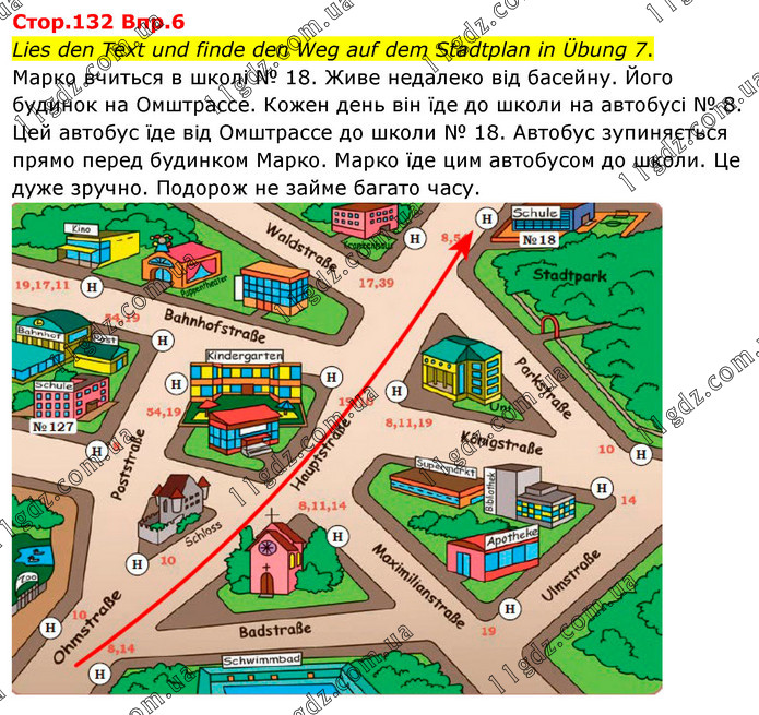 Стор.132 Впр.6 Lies den Text und finde den Weg auf dem Stadtplan in Übung 7. Марко вчиться в школі № 18. Живе недалеко від басейну. Його будинок на Омштрассе. Кожен день він їде до школи на автобусі № 8. Цей автобус їде від Омштрассе до школи № 18. Автобус зупиняється прямо перед будинком Марко. Марко їде цим автобусом до школи. Це дуже зручно. Подорож не займе багато часу.