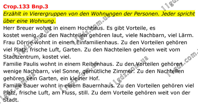 Cтоp.133 Bпp.3 Erzählt in Vierergruppen von den Wohnungen der Personen. Jeder spricht über eine Wohnung. Herr Breuer wohnt in einem Hochhaus. Es gibt Vorteile, es kostet wenig. Zu den Nachteilen gehören laut, viele Nachbarn, viel Lärm. Frau Dörrie wohnt in einem Einfamilienhaus. Zu den Vorteilen gehören viel Platz, frische Luft, Garten. Zu den Nachteilen gehören weit vom Stadtzentrum, kostet viel. Familie Paulis wohnt in einem Reihenhaus. Zu den Vorteilen gehören wenige Nachbarn, viel Sonne, gemütliche Zimmer. Zu den Nachteilen gehören kein Garten, ein kleiner Hof. Familie Bauer wohnt in einem Bauernhaus. Zu den Vorteilen gehören viel Platz, frische Luft, am Fluss, still. Zu dem Vorteile gehören weit von der Stadt.