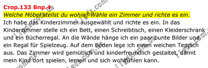 Стор.133 Впр.4 Welche Möbel stellst du wohin? Wähle ein Zimmer und richte es ein. Ich habe das Kinderzimmer ausgewählt und richte es ein. In das Kinderzimmer stelle ich ein Bett, einen Schreibtisch, einen Kleiderschrank und ein Bücherregal. An die Wände hänge ich ein paar bunte Bilder und ein Regal für Spielzeug. Auf dem Boden lege ich einen weichen Teppich aus. Das Zimmer wird gemütlich und kinderfreundlich gestaltet, damit mein Kind dort spielen, lernen und sich wohlfühlen kann.