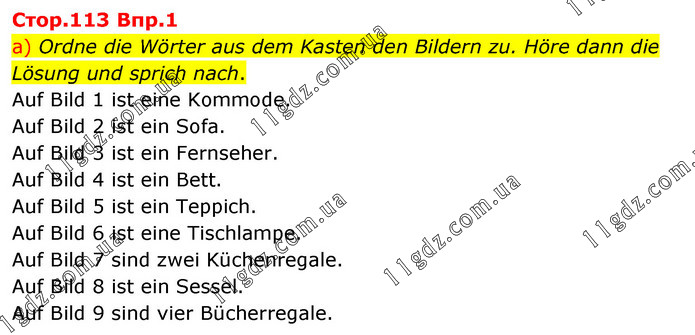Стор.113 Впр.1 a) Ordne die Wörter aus dem Kasten den Bildern zu. Höre dann die Lösung und sprich nach. Auf Bild 1 ist eine Kommode. Auf Bild 2 ist ein Sofa. Auf Bild 3 ist ein Fernseher. Auf Bild 4 ist ein Bett. Auf Bild 5 ist ein Teppich. Auf Bild 6 ist eine Tischlampe. Auf Bild 7 sind zwei Küchenregale. Auf Bild 8 ist ein Sessel. Auf Bild 9 sind vier Bücherregale.