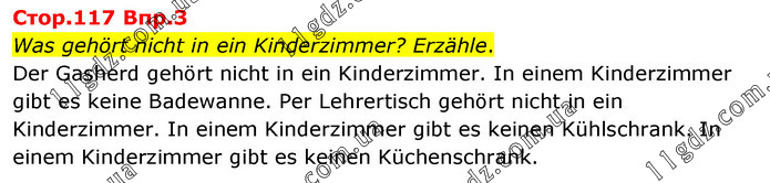 Cтоp.117 Bпp.3 Was gehört nicht in ein Kinderzimmer? Erzähle. Der Gasherd gehört nicht in ein Kinderzimmer. In einem Kinderzimmer gibt es keine Badewanne. Per Lehrertisch gehört nicht in ein Kinderzimmer. In einem Kinderzimmer gibt es keinen Kühlschrank. In einem Kinderzimmer gibt es keinen Küchenschrank.